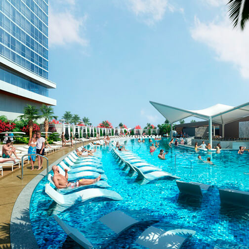 Looking for a place to claim as your own for the day? We offer 50 luxurious poolside cabanas that facilitate a personal relaxation experience. With three outdoor bars and two food venues, there’s something for everyone.